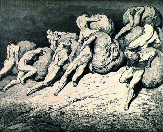 The sin of Gluttony is overindulgence. Too much of anything is never a good thing, right? The over consumption that comes from being a glutton leads to waste and when you consider that food was scare and famines were frequent during the time Dante wrote, you get a better understanding why gluttony was such a big deal – if greedy rich people eat all the rood, that leaves little left for the needy and poor. Beyond just overeating, Gula is also associated with selfishness and the sin of gluttony occurs when you place your own desires above those of others. Similar to Lust, the deadly sin of Gluttony causes the sinner to desire something above God – which is a surefire ticket to Dante’s Inferno, where said sinner can eat whatever they desired most in life again, and again, and again for all time… no matter how sick of it they become.
