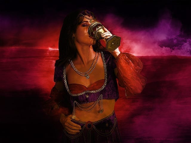 This time the seductress was wearing purple and scarlet and fine jewels graced her neck, yet her long, black hair covered her face so that Alan couldn’t see her features as she walked over towards Bates and gave him a kiss on the cheek.