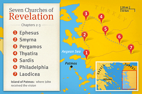 Location of the 7 Churches: Ephesus, Smyrna, Pergamum, Thyatira, Sardis, Philadelphia, Laodicea. All of these are in Asia Minor.