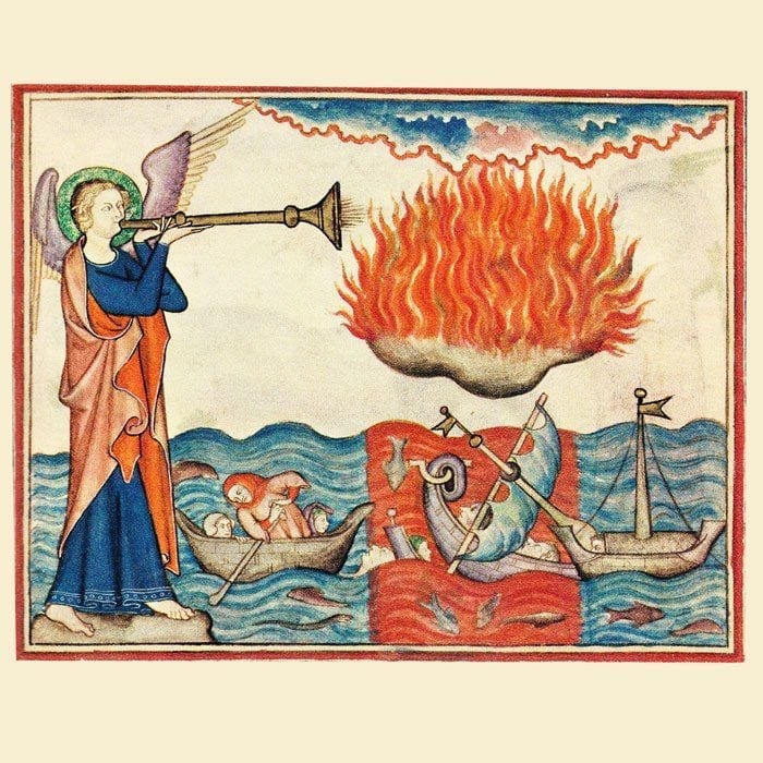After the seven angels blow their seven trumpets in Revelation Chapter 8, an eight angel brings out a golden censer filled with fire from the heavenly altar, and throws it to the earth – unleashing peals of thunder, rumblings, flashes of lightning, and an earthquake.