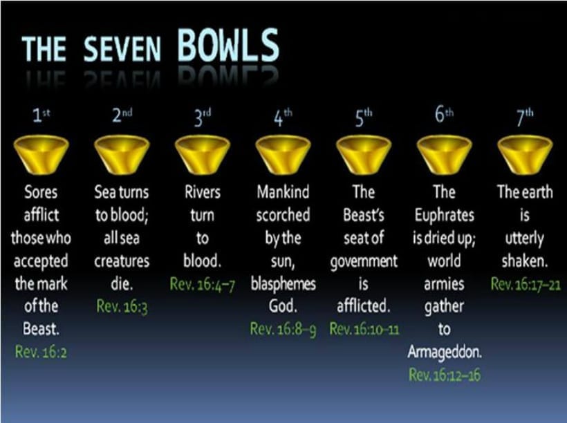 7 Bowls of Revelation: more disasters are unleashed upon our world as each of the Seven Angels pour out a bowl filled with God’s wrath.
